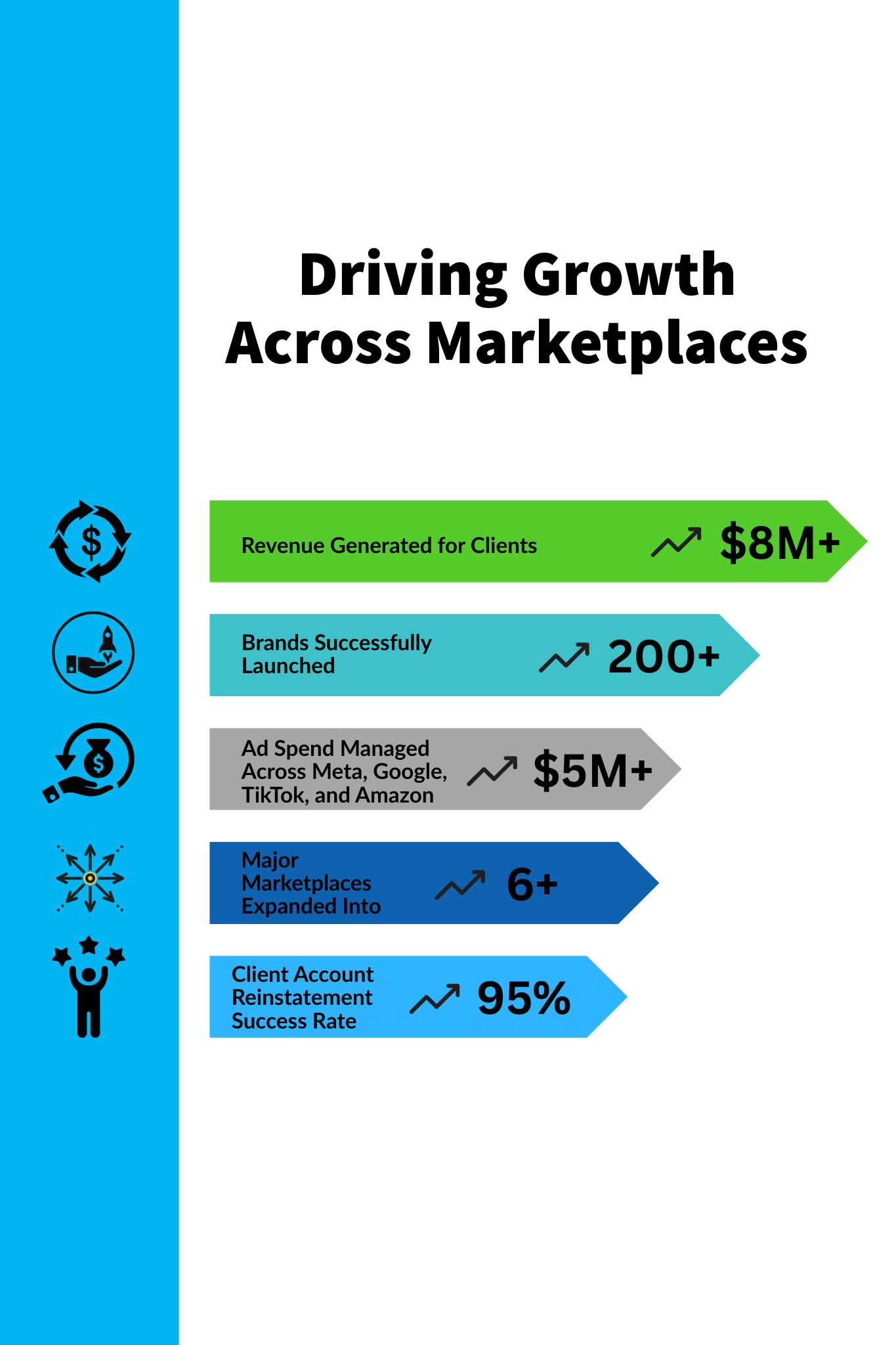 We help brands launch, advertise, and grow on platforms like Amazon, Walmart, TikTok Shop, eBay, Etsy, and Shopify. Whether it’s managing ad campaigns, reinstating suspended accounts, or handling tax and company setup, our goal is to simplify growth so you can focus on selling.